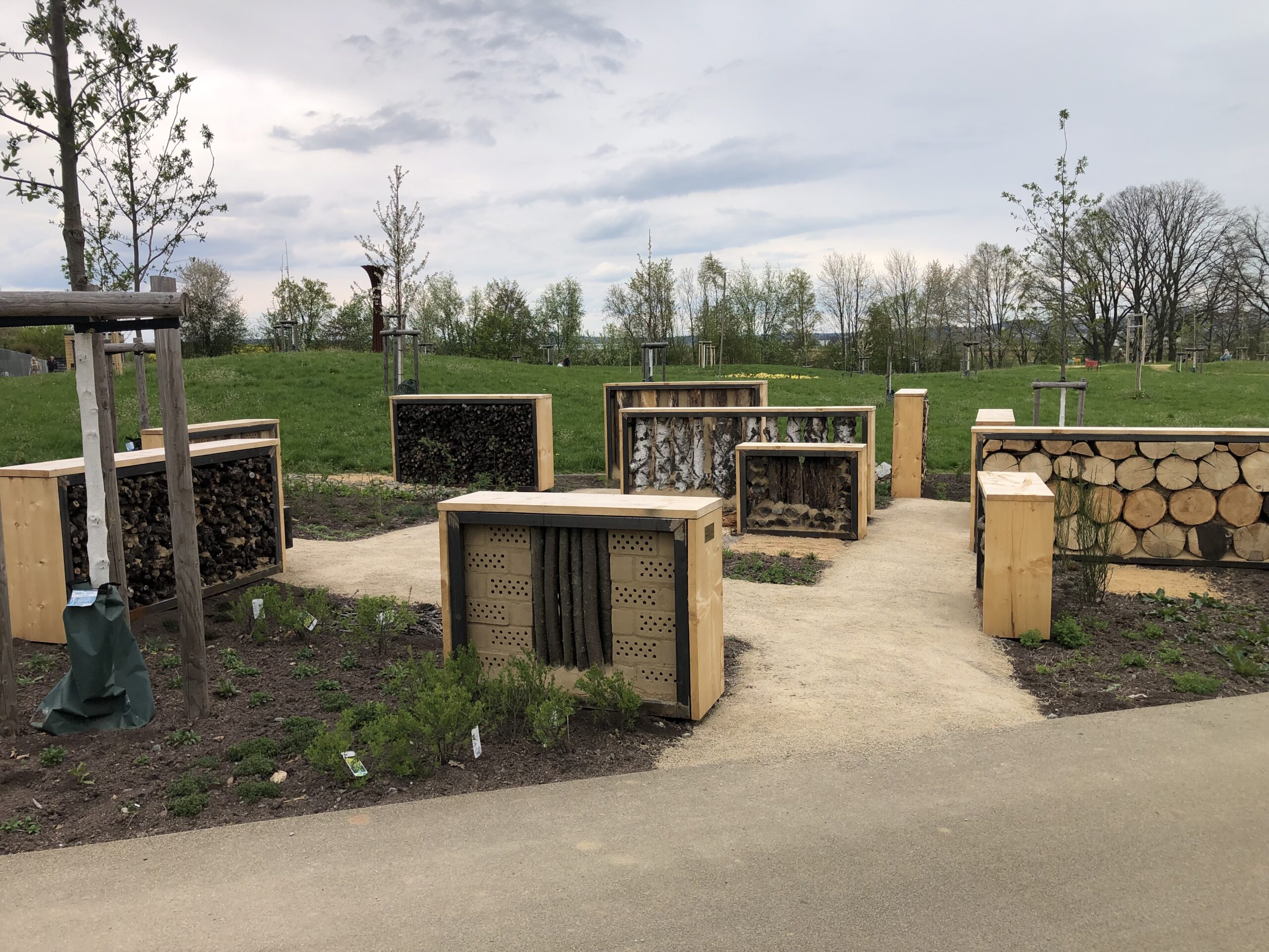 Zur Landesgartenschau wurden Insektenhotels aufgestellt, die mit unterschiedlichsten Materialien zusammen mit Baulehm den Tieren eine neue Heimat geben.